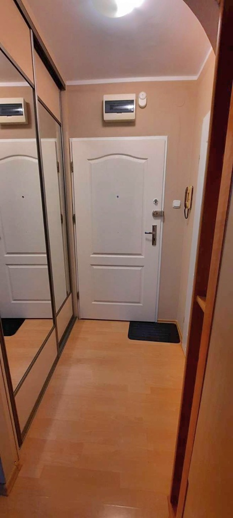 W przedpokoju dostępna jest pojemna zabudowa z lustrem.