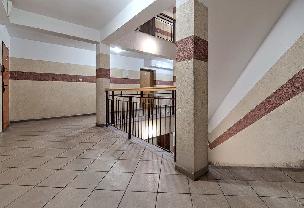 Wejście do klatki schodowej zabezpieczone domofonem.