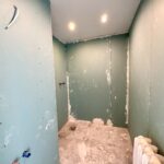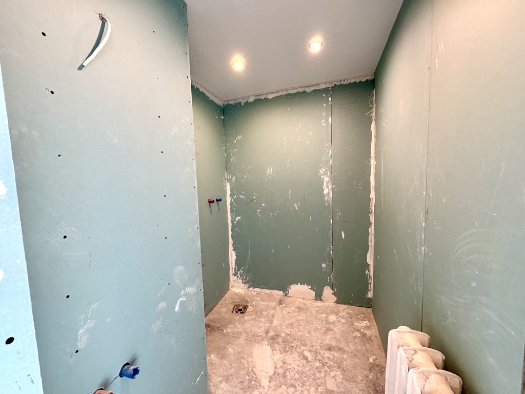 W łazience wyprowadzona instalacja sanitarna i elektryczna, został podwieszony sufit i położone regipsy - przygotowane pod kafelki i armaturę wg. własnego uznania