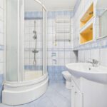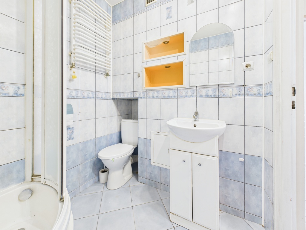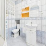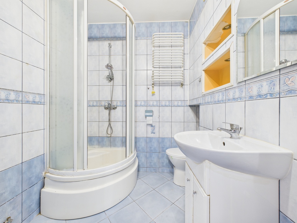 Łazienka wyposażona jest w kabinę prysznicową, umywalkę, toaletę, lustro.