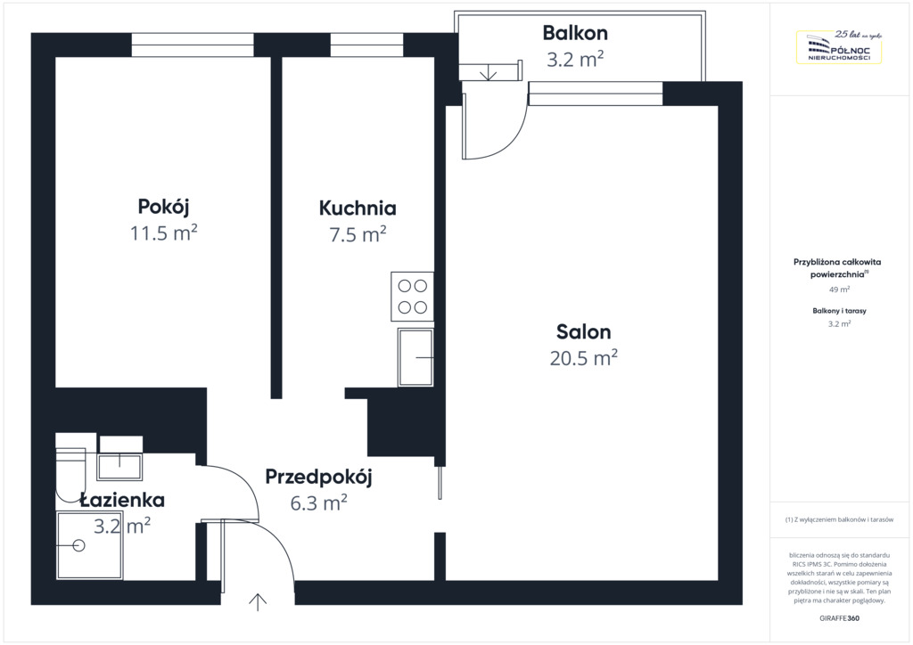 - salonu - 20,50 m2 – z przynależnym balkonem – 3,2 m2,