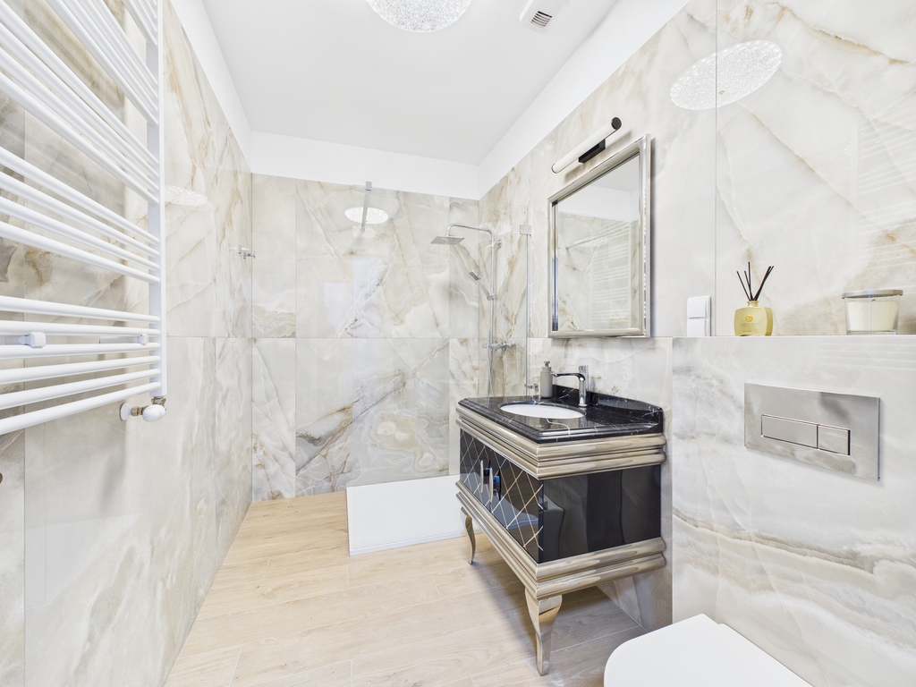 - Łazienka: hiszpańskie płytki MAINZU, kabina Radaway