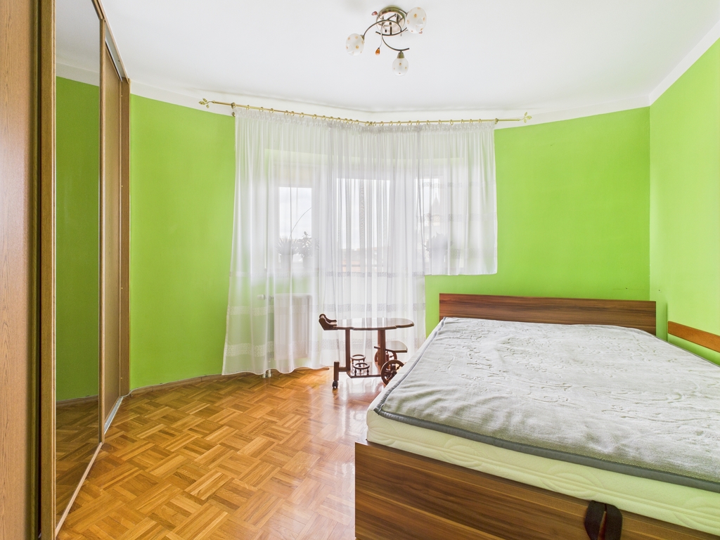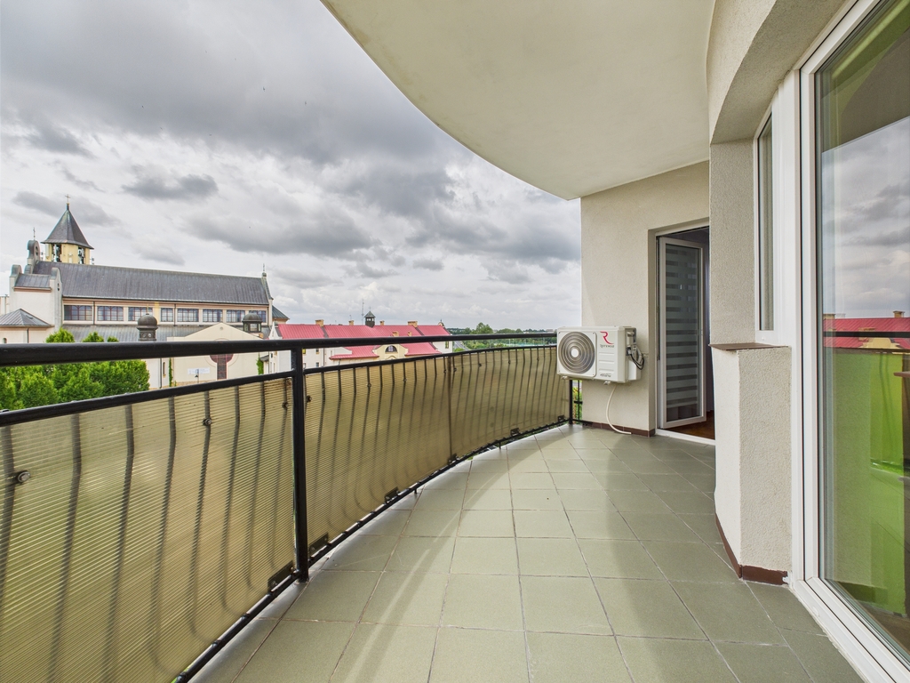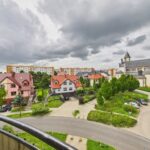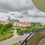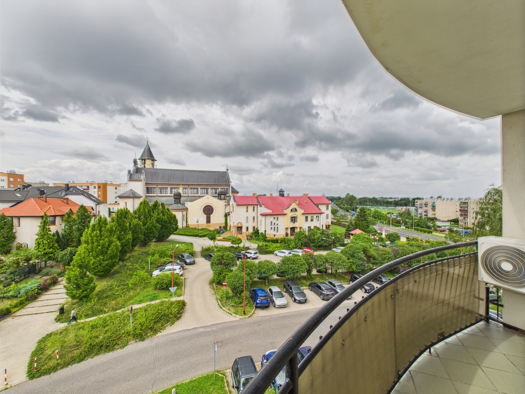 - przestronny balkon od strony południowej z widokiem na osiedle domków mieszkalnych oraz plac przed kościołem