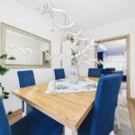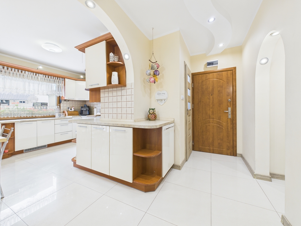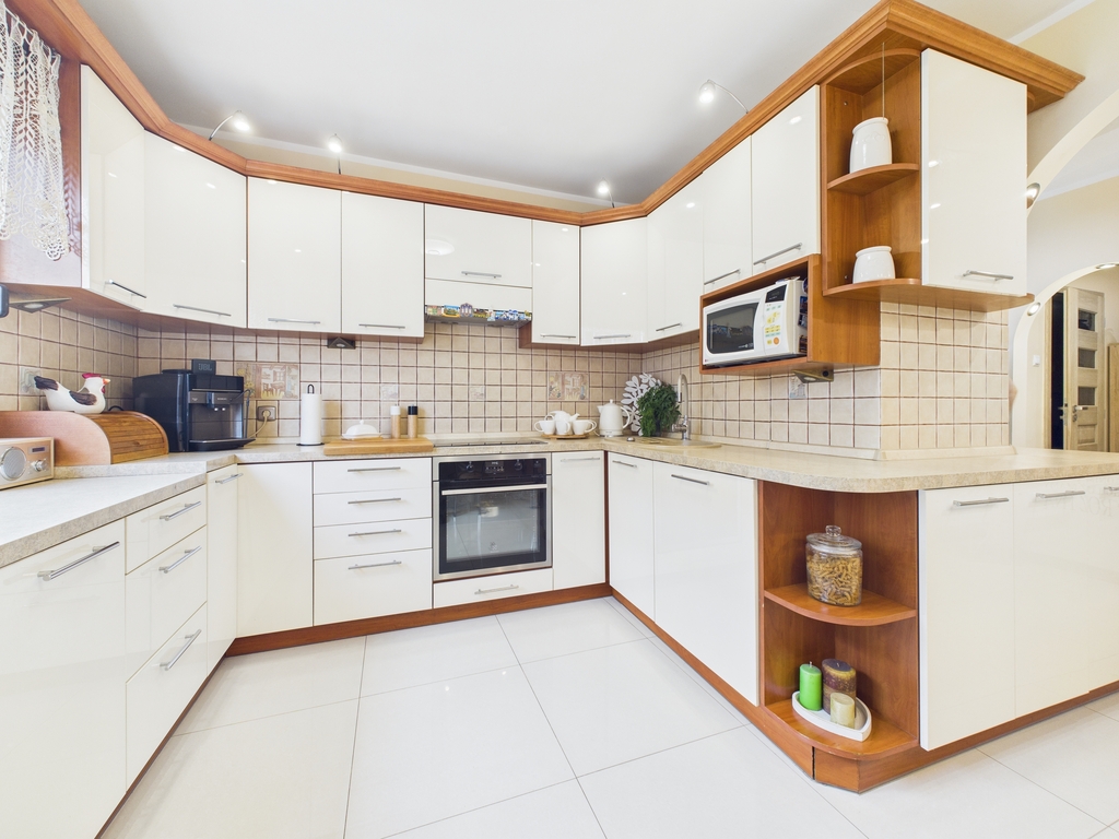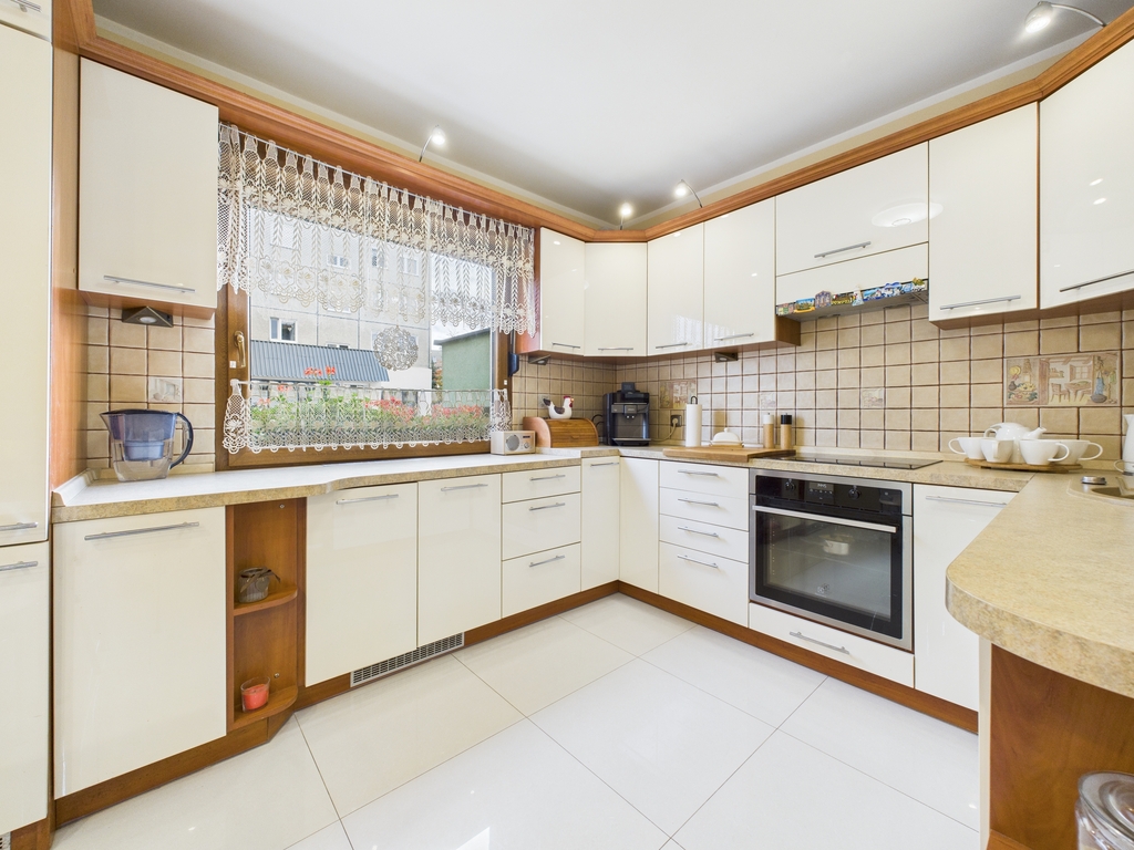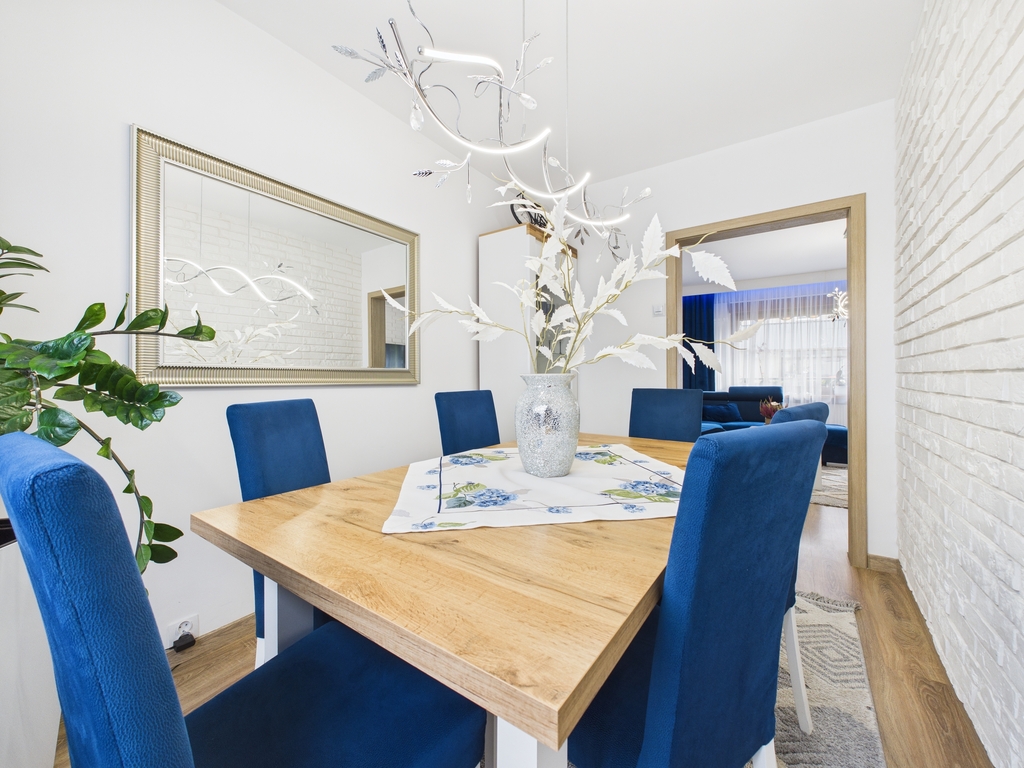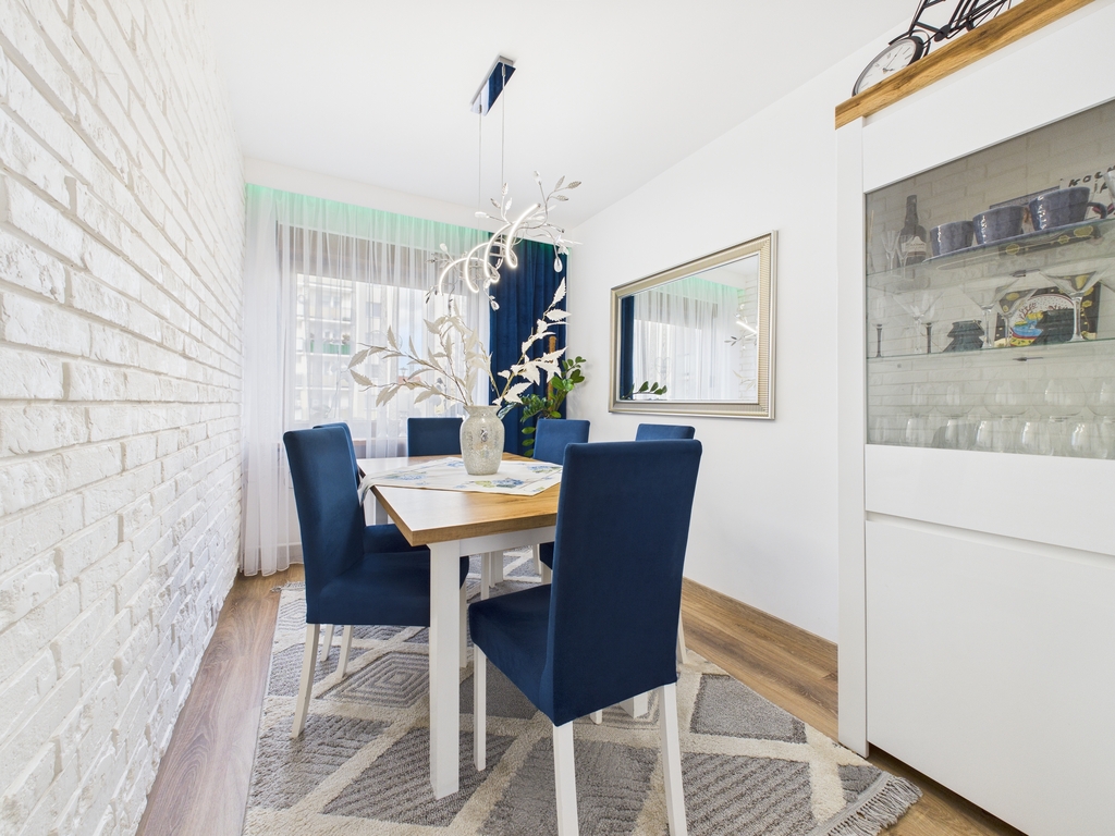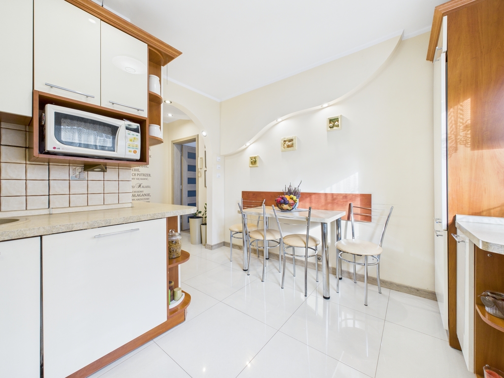 - kuchnia wyposażona w meble w zabudowie, zlewozmywak, płytę indukcyjną, lodówko- zamrażarkę w zabudowie, piekarnik, mikrofalówkę, zmywarkę, stół z krzesłami,