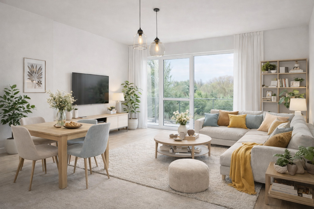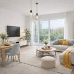- Duży, jasny pokój dzienny z ogromnymi przeszkleniami, które zapewniają doskonałe doświetlenie wnętrza przez cały dzień. Bezpośrednie wyjście na prywatny ogródek tworzy idealne miejsce do relaksu, spotkań z rodziną i odpoczynku na świeżym powietrzu.