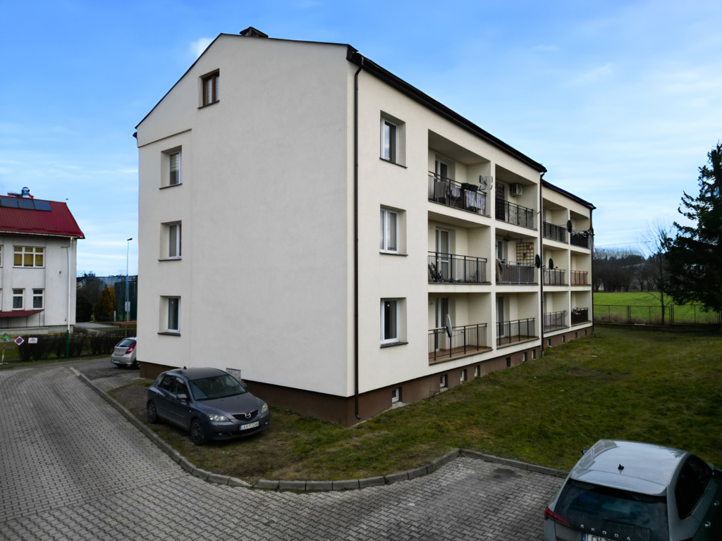 Niedaleko bloku jest duży parking.