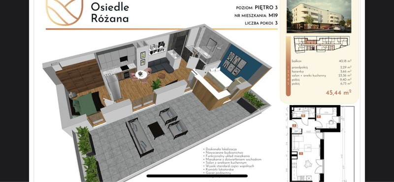 Oferujemy Państwu na sprzedaż nowe, jednopoziomowe mieszkanie o powierzchni 45,44 m2 z prywatnym tarasem o powierzchni 40 m2 . Mieszkanie znajduje się na 3 piętrze, przynależy do niego komórka lokatorska. Istnieje możliwość zakupu miejsca postojowego w garażu podziemnym. Inwestycja zlokalizowana jest przy ul. Różanej w Hrubieszowie.