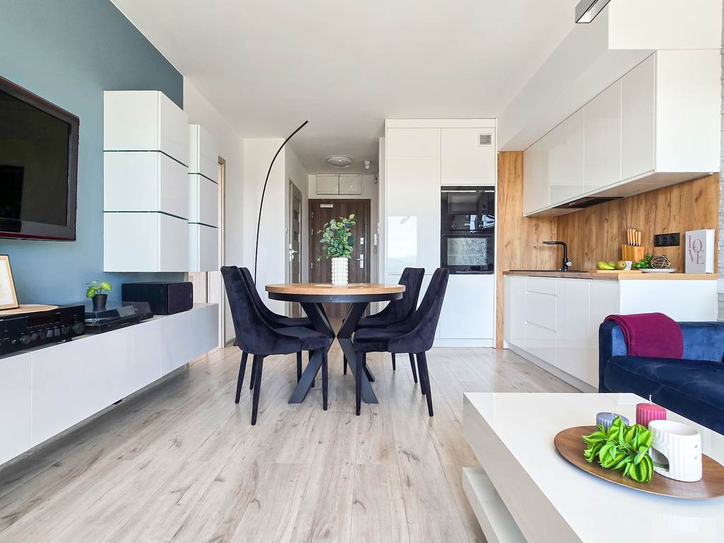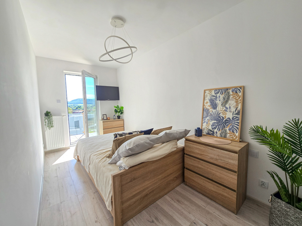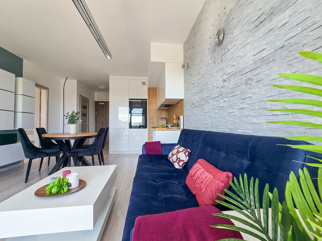 Słoneczny salon połączony jest z aneksem kuchennym. Przestrzeń zaaranżowana została w niezwykle w przemyślany i funkcjonalny sposób. Zabudowa meblowa w kuchni wyposażona jest we wszystkie niezbędne sprzęty AGD (lodówka z zamrażarką w zabudowie, piekarnik, okap, zmywarka oraz płyta indukcyjna). Wszystkie sprzęty wysokiej klasy nowe - nigdy nieużywane. W przestrzeni dziennej znajduje się także okrągły - rozkładany stół z eleganckimi krzesłami oraz wygodna sofą. Zarówno z salonu jak i sypialni możemy wyjść na spory balkon i rozkoszować się cudownym widokiem na całe pasmo górskie oraz stare miasto. Sypialnia posiada komfortowe łóżko małżeńskie oraz bardzo pojemną szafę w zabudowie. Jasna i bardzo elegancka łazienka z kabiną prysznicową wyposażona jest w pralkę. W przedpokoju znajdziemy dodatkową przestrzeń do przechowywania - lustrzaną szafę w zabudowie.