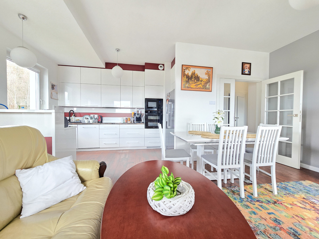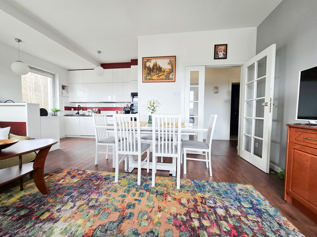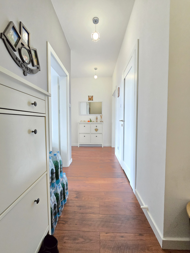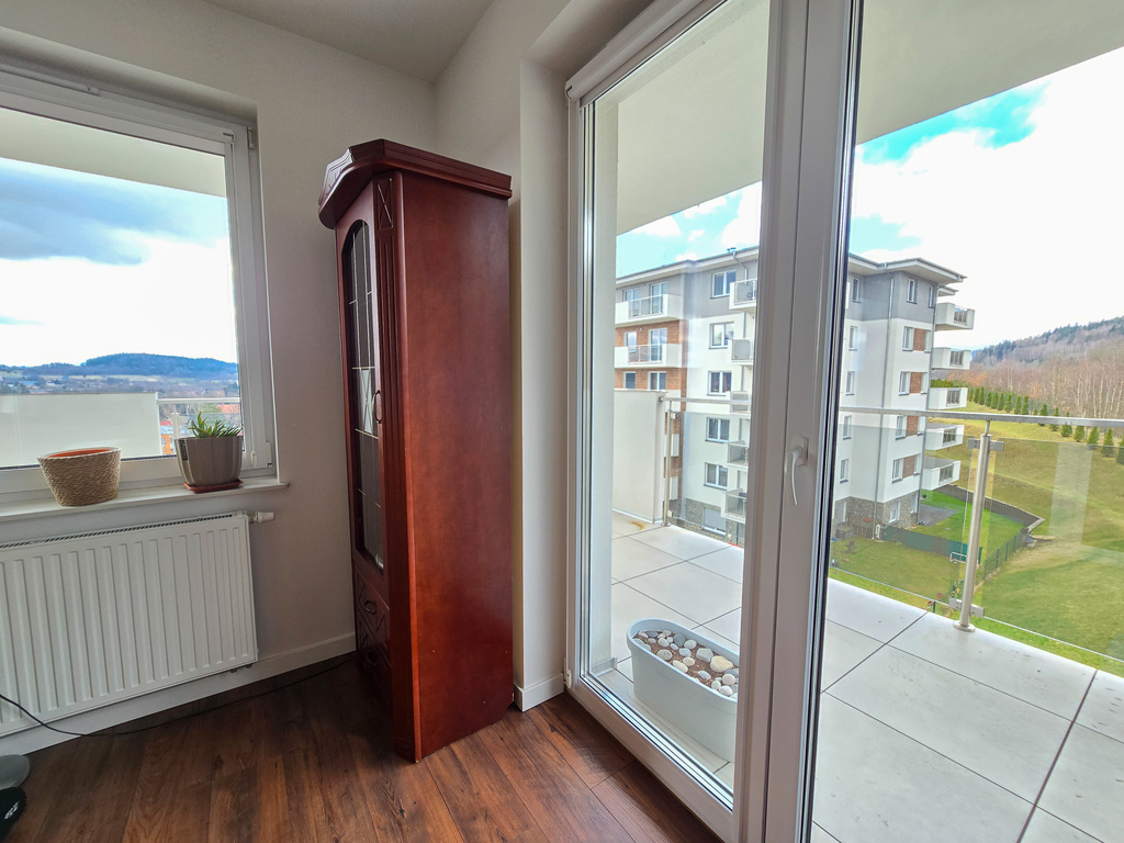 Słoneczny i przestronny salon połączony jest z otwartą kuchnią. Z salonu możemy wyjść również na duży balkon [ok 13m² ] i rozkoszować się cudownym widokiem na góry. Nowoczesna zabudowa meblowa w kuchni wyposażona jest we wszystkie niezbędne sprzęty AGD (2-drzwiowa lodówka z zamrażarką, piekarnik, okap, zmywarka oraz płyta indukcyjna). W salonie swobodnie mieszczą się 2 sofy, a także stół z krzesłami do wygodnego spożywania posiłków. Pierwsza sypialnia posiada wygodne łóżko małżeńskie i bardzo pojemną szafę, druga mniejsza natomiast, świetnie sprawdzi się jako pokój dla dziecka. Klasyczna i jasna łazienka z kabiną prysznicową to funkcjonalność i elegancja w czystej postaci. W przedpokoju znajdziemy miejsce na odzież wierzchnią oraz lustrzaną szafę w zabudowie.