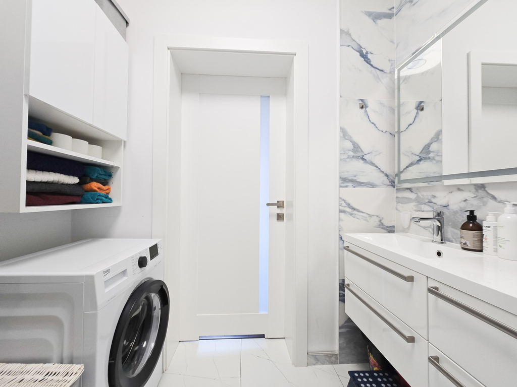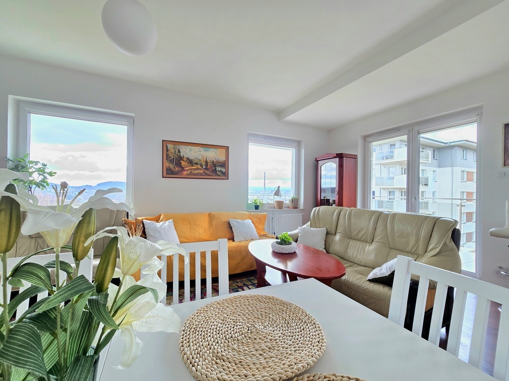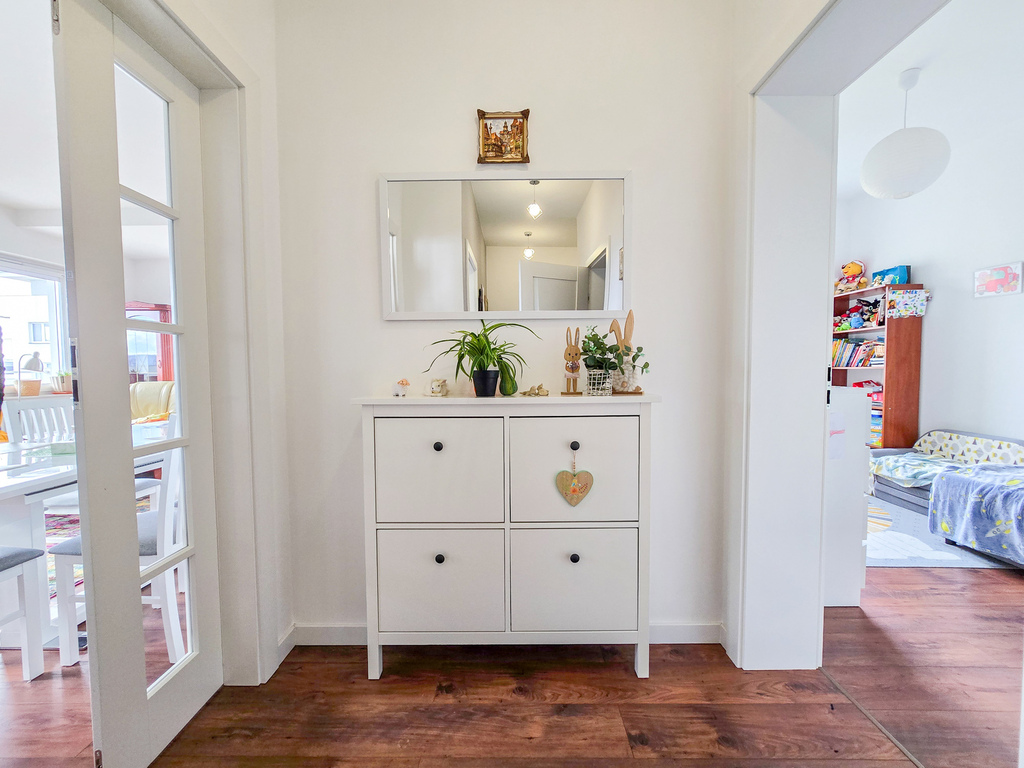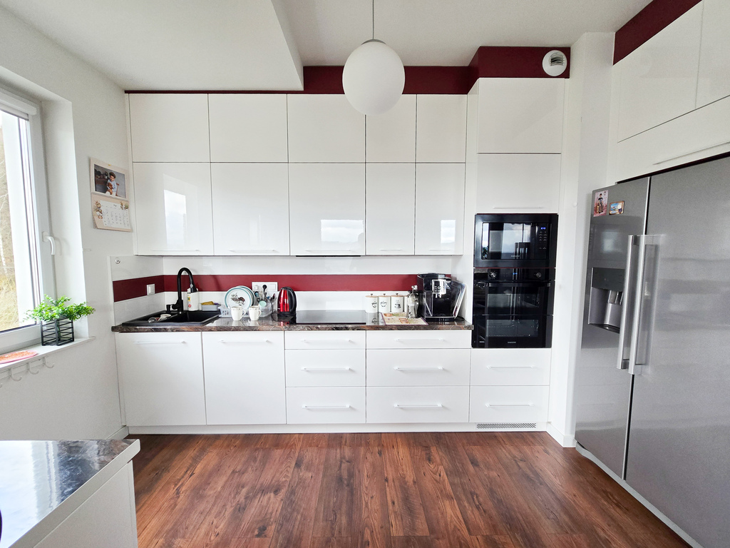 Słoneczny i przestronny salon połączony jest z otwartą kuchnią. Z salonu możemy wyjść również na duży balkon [ok 13m² ] i rozkoszować się cudownym widokiem na góry. Nowoczesna zabudowa meblowa w kuchni wyposażona jest we wszystkie niezbędne sprzęty AGD (2-drzwiowa lodówka z zamrażarką, piekarnik, okap, zmywarka oraz płyta indukcyjna). W salonie swobodnie mieszczą się 2 sofy, a także stół z krzesłami do wygodnego spożywania posiłków. Pierwsza sypialnia posiada wygodne łóżko małżeńskie i bardzo pojemną szafę, druga mniejsza natomiast, świetnie sprawdzi się jako pokój dla dziecka. Klasyczna i jasna łazienka z kabiną prysznicową to funkcjonalność i elegancja w czystej postaci. W przedpokoju znajdziemy miejsce na odzież wierzchnią oraz lustrzaną szafę w zabudowie.