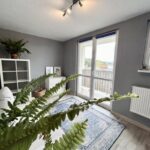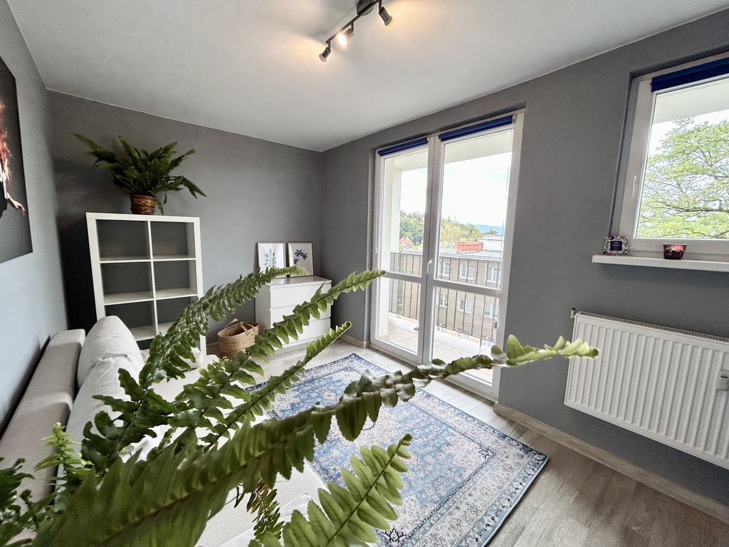 - słonecznego salonu z wyjściem na balkon z którego roztacza się widok na panoramę miasta