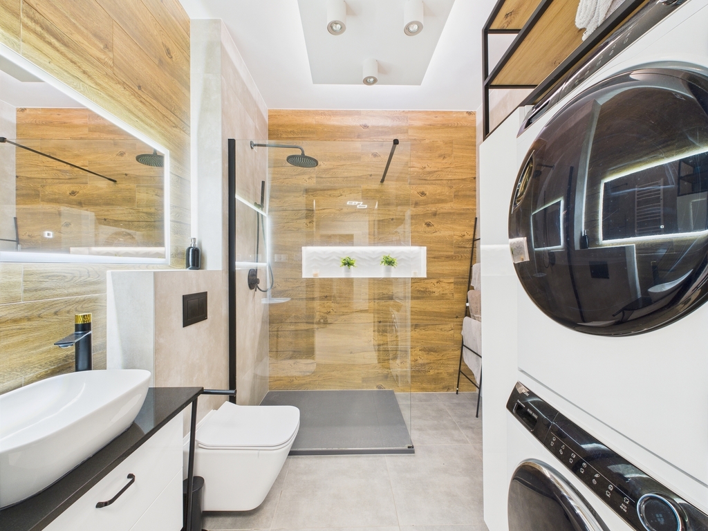 • Łazienka – 5,83 m² wyposażona w duży prysznic, WC oraz umywalkę