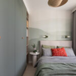 - sypialnia (7,5 m²) – wygodne łóżko z pojemnikiem, pojemna szafa