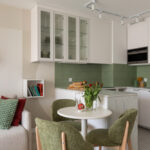 Rozkład: - salon z aneksem kuchennym – zabudowa kuchenna, AGD, stół, kanapa