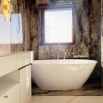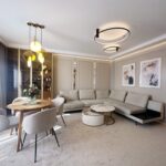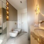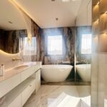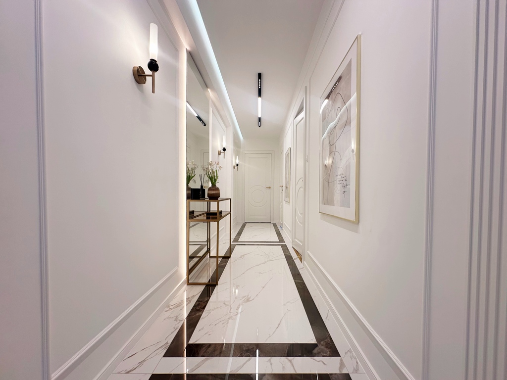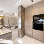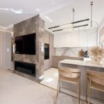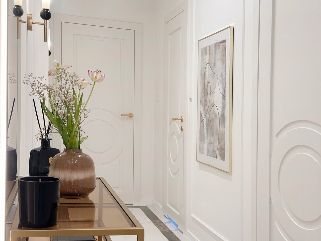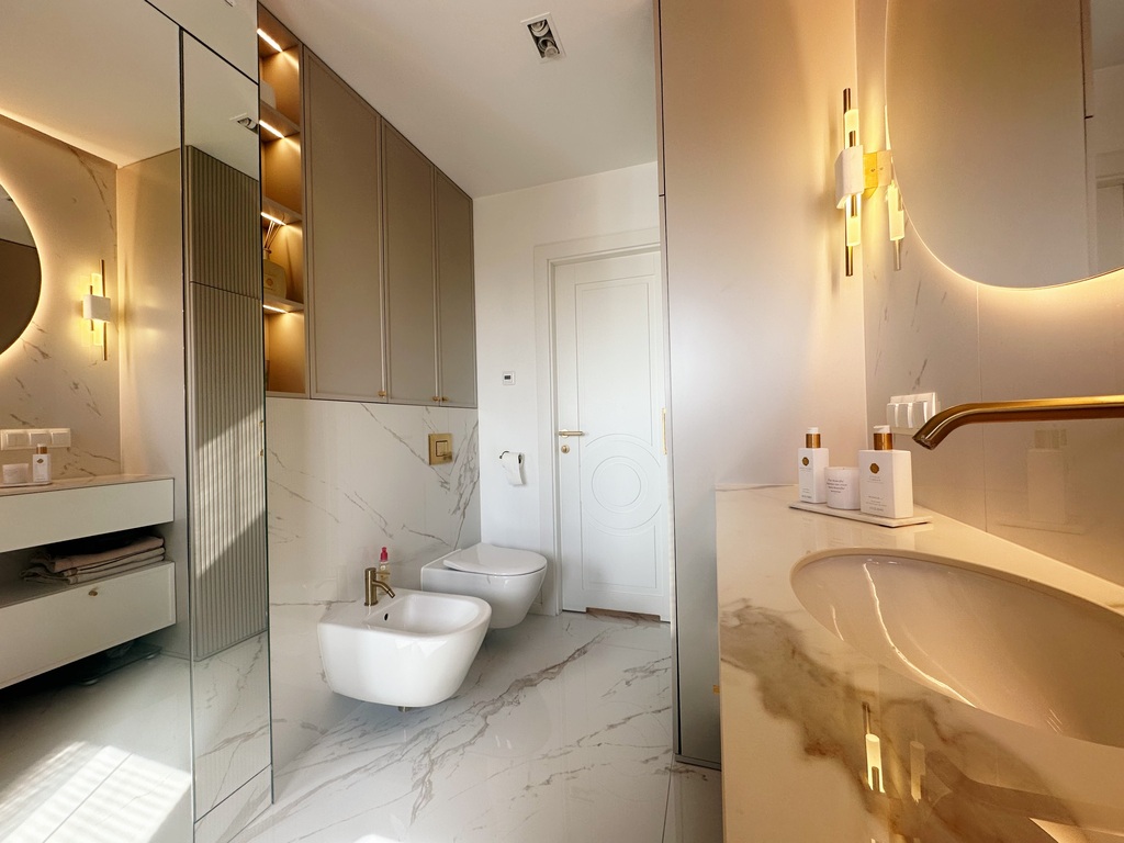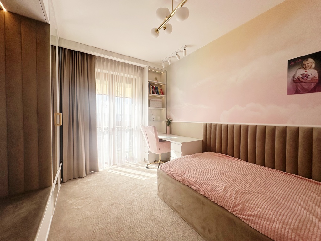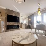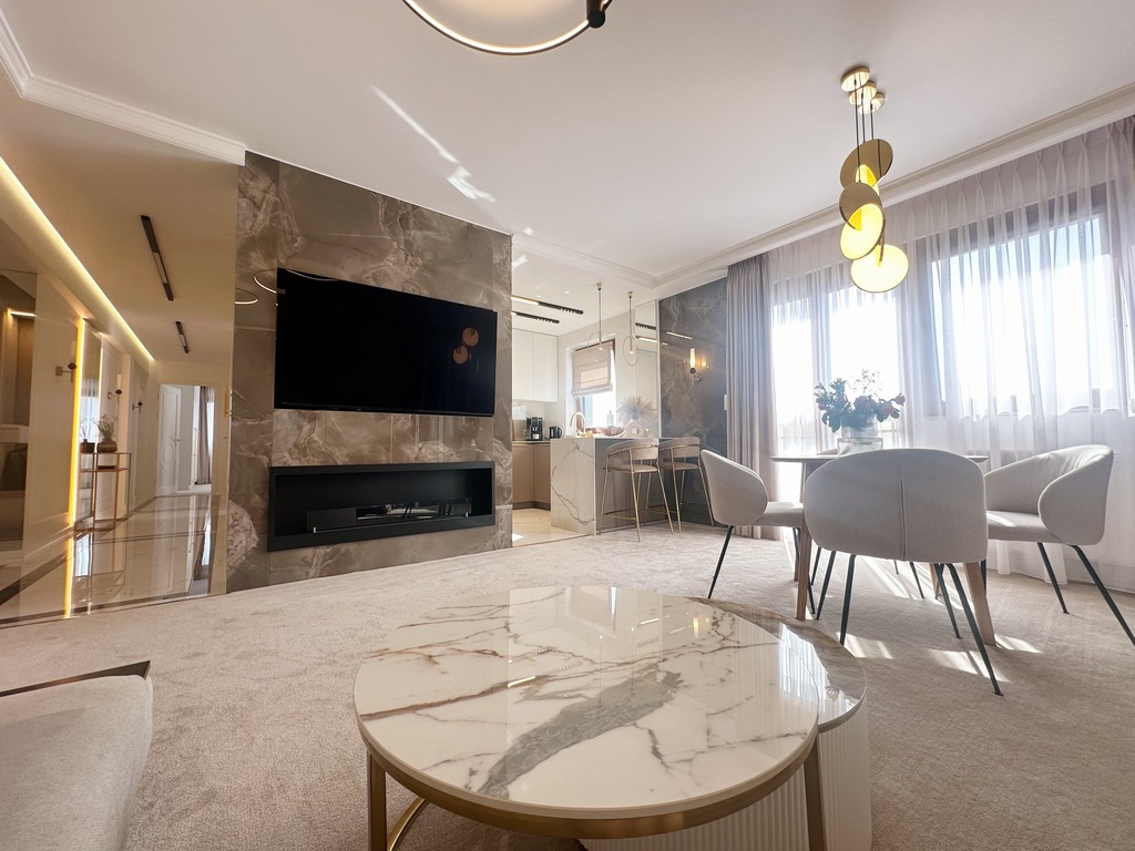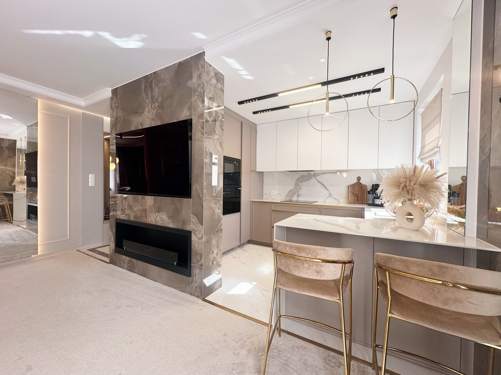 Apartament został wykończony w bardzo wysokim standardzie, materiałami najwyższej klasy. Przestrzeń została zaprojektowana praktycznie a zarazem w bardzo designerskim stylu z nutą luksusu. Znajdziemy tutaj spiek, wielkoformatowe płytki, wysokiej jakości wykładzinę, zabudowę stolarską, kominek bio. Na całej powierzchni mieszkania znajduje się ogrzewanie podłogowe.