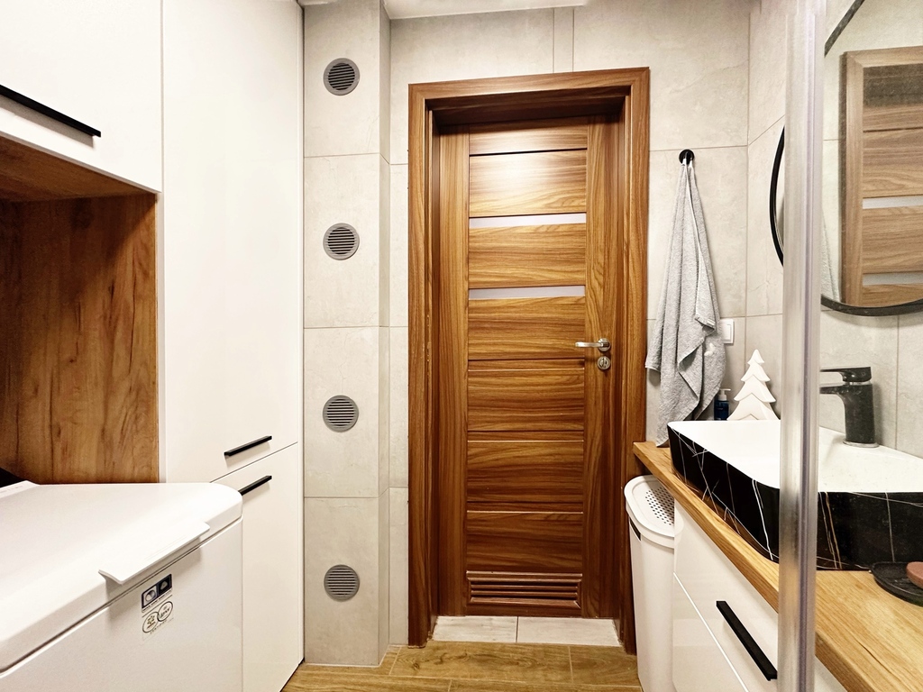 Układ pomieszczeń jest bardzo funkcjonalny, tworzy bardzo przytulne, ciepłe i jasne mieszkanie.