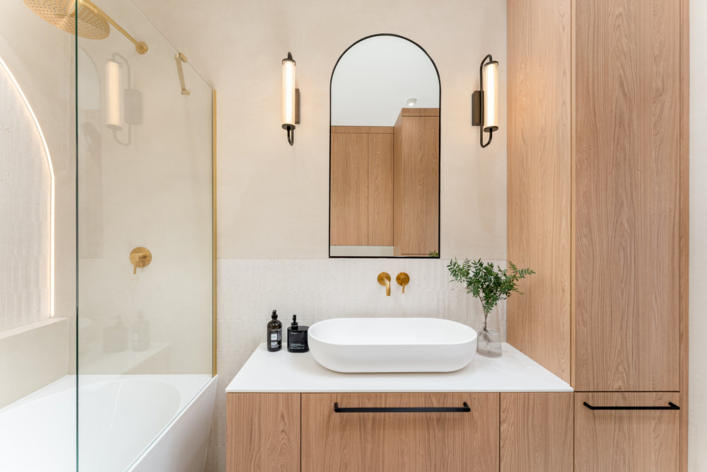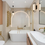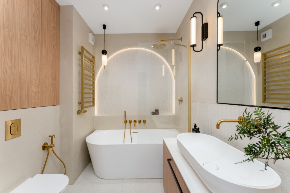 • Łazienka (5,8 m²) z prysznicem typu walk-in i podwójną umywalką