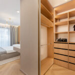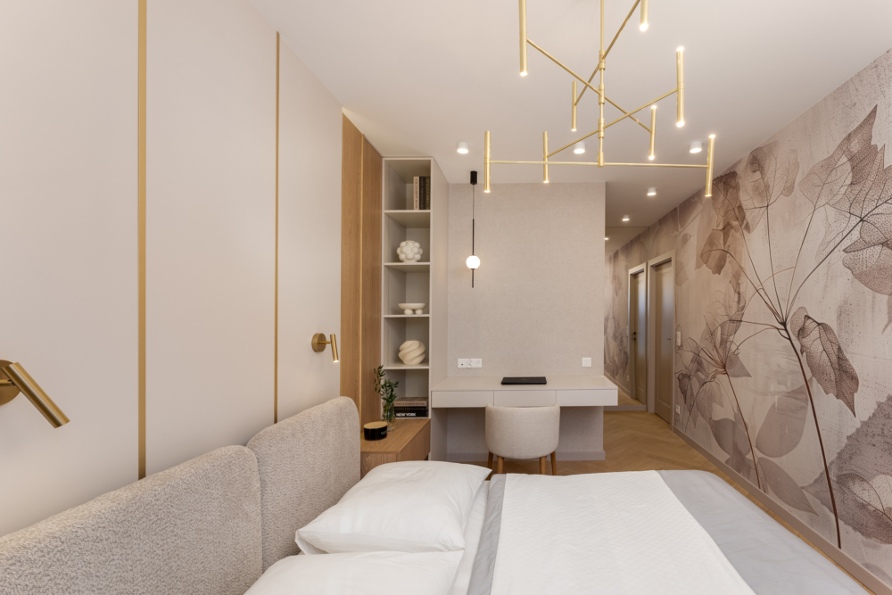• Sypialnia główna (14 m²) z zabudową i łóżkiem