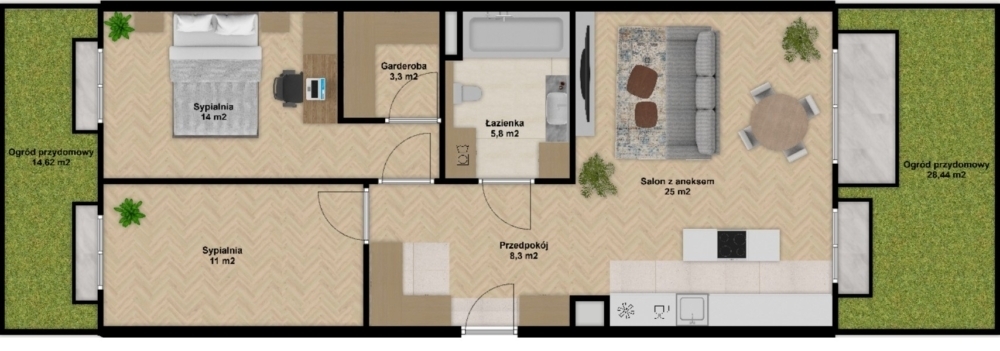 • Druga sypialnia/gabinet (11 m²) z wyjściem do drugiego ogródka (14,62 m²)