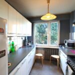 Kuchnia j z meblami w zabudowie i w pełni wyposażona w sprzęty kuchenne, z dużym oknem i widokiem na drzewa.