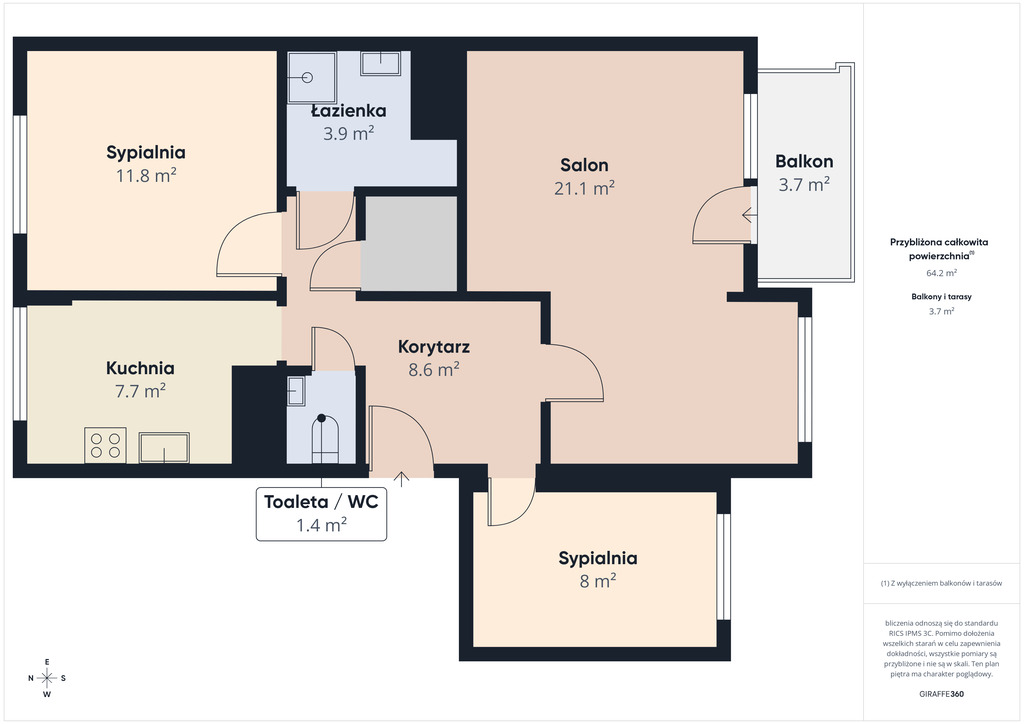 Mieszkanie o powierzchni 64,3 m2 usytuowane jest na 2 piętrze w czteropiętrowym bloku.