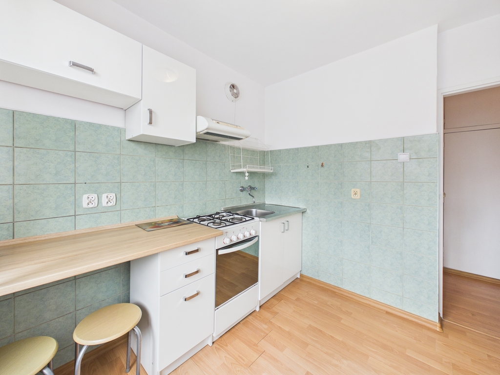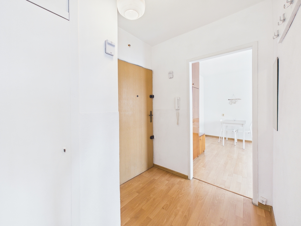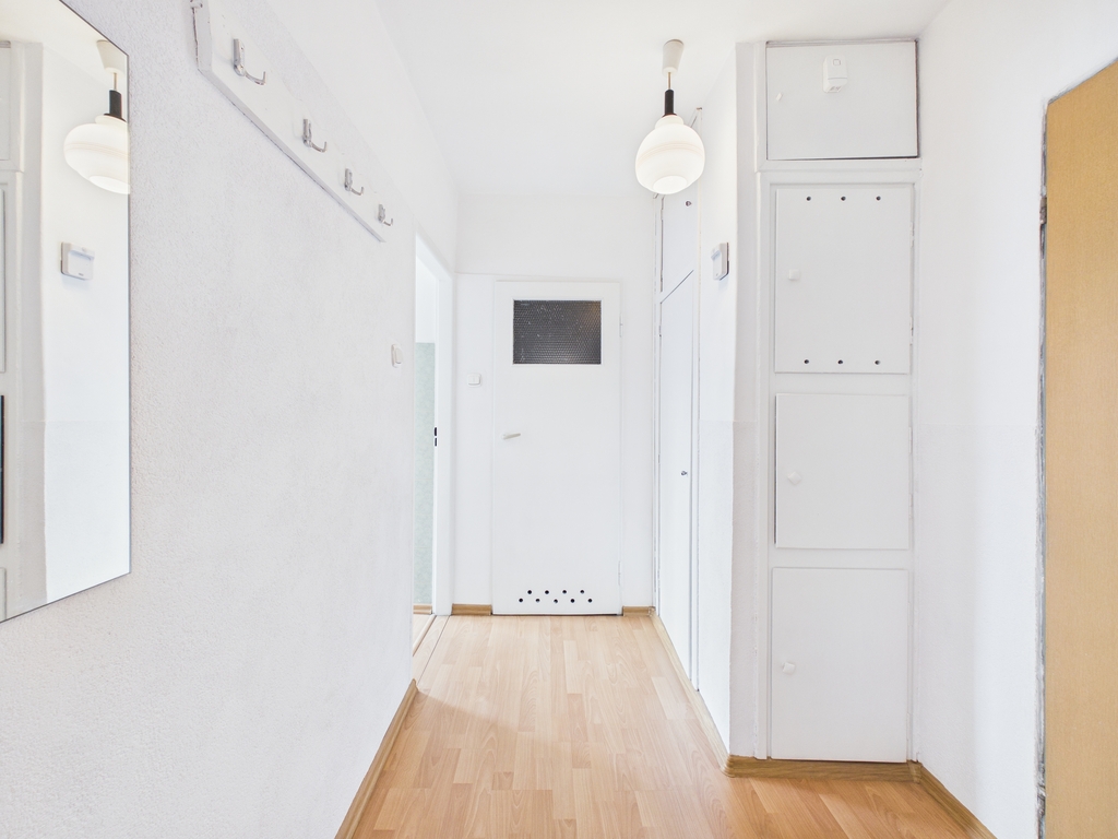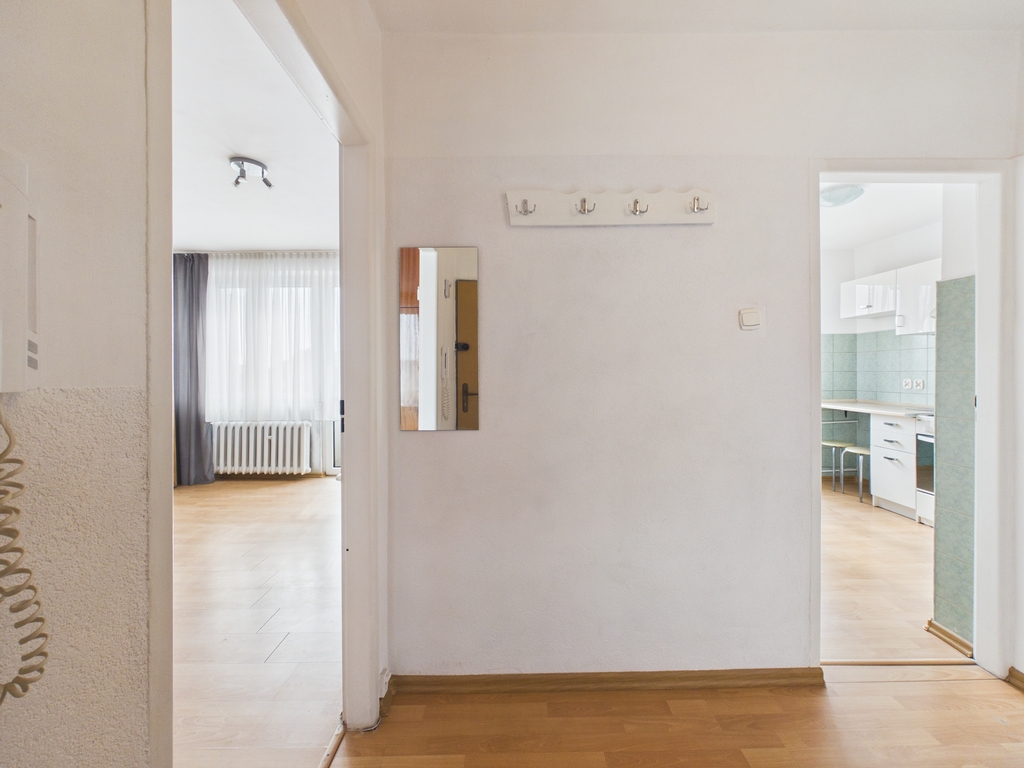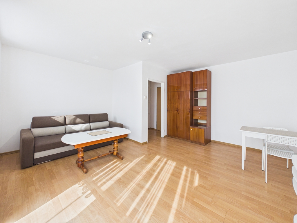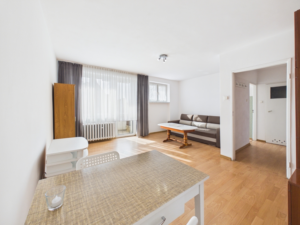 Jednopokojowe mieszkanie o powierzchni 34,5 m2 położone na drugim piętrze czteropiętrowego bloku.