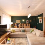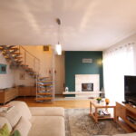 -dużego otwartego salonu z czynnym kominkiem i wyjściem na balkon