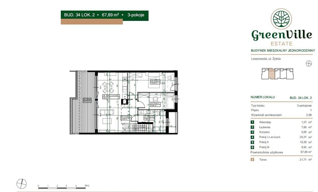 Rozkład pomieszczeń (powierzchnia użytkowa – 67,89 m²):