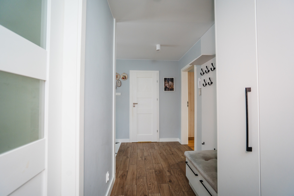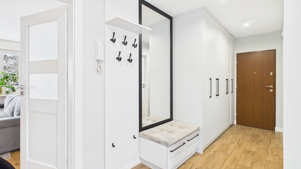 • Przedpokój z pojemnymi szafami w stałej zabudowie.