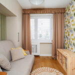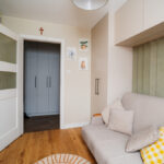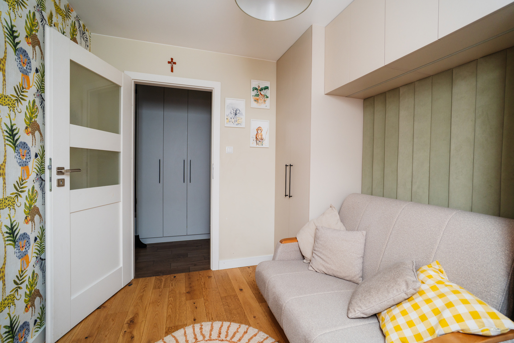 • Sypialnia z pojemną zabudową stolarską oraz sofą.