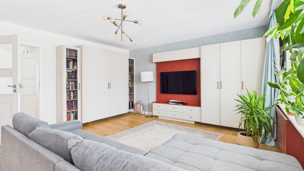 • Salon z wygodną kanapą oraz łóżkiem chowanym w zabudowie – idealne rozwiązanie łączące funkcjonalność i estetykę.