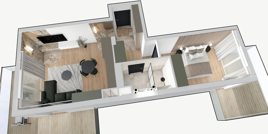 Przedstawione wizualizacje i grafiki mają charakter wyłącznie poglądowy i stanowią wyłącznie materiał pomocniczy, ułatwiający zorientowanie się w ogólnym wyglądzie oferowanej nieruchomości.