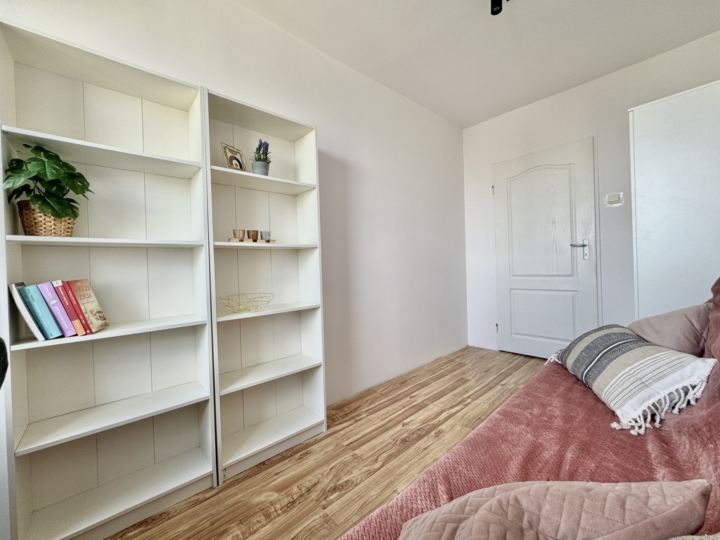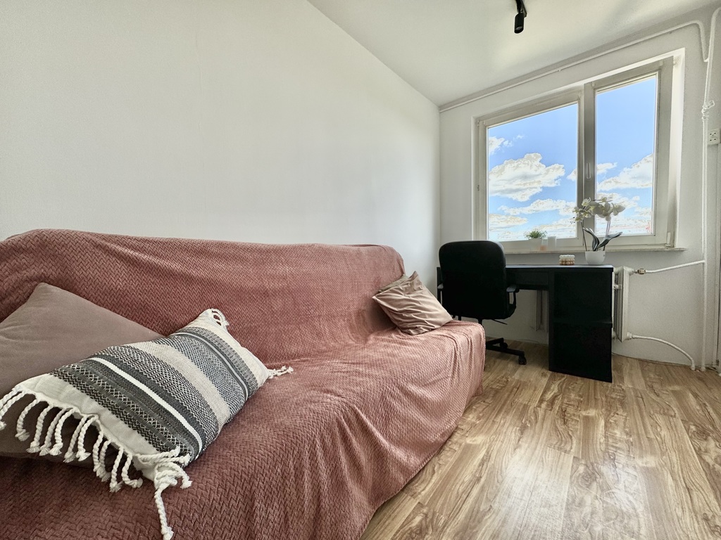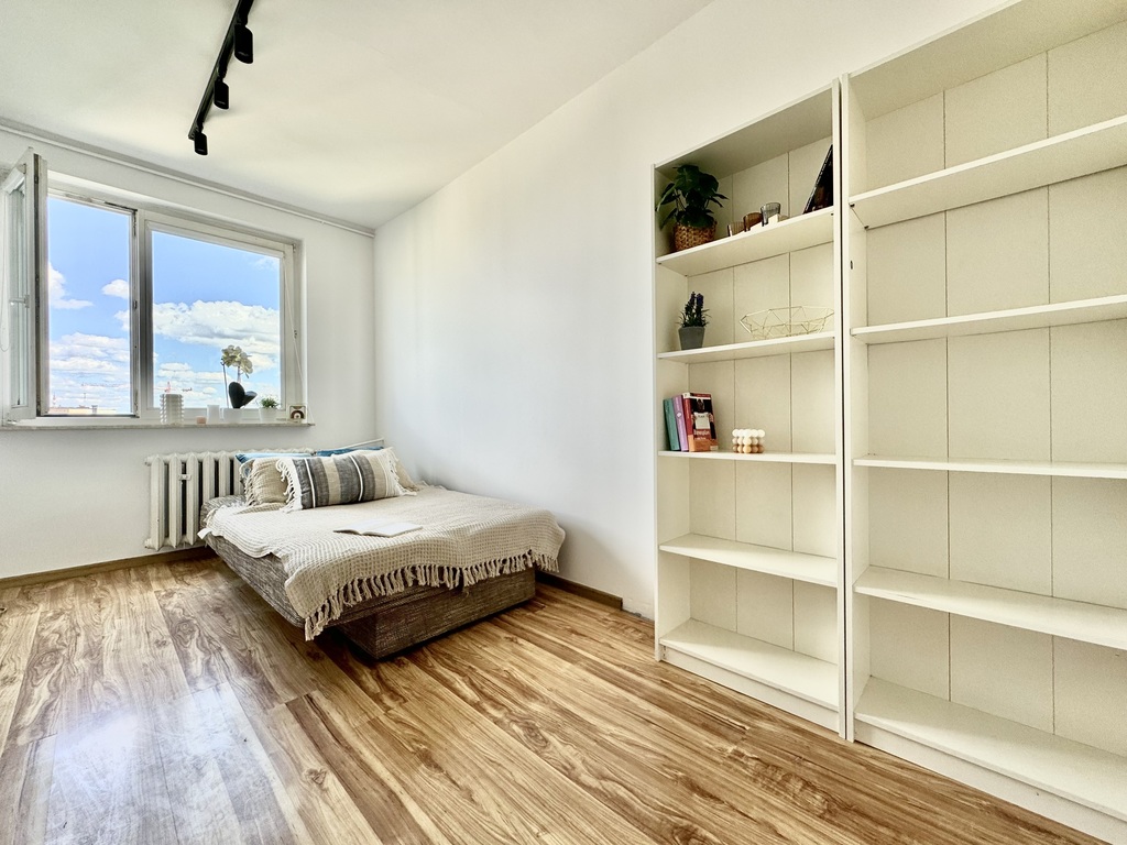 Mieszkanie jest jasne, przestronne z oknami wychodzącymi na zachód. Z okien rozprzestrzenia się widok na tereny zielone osiedla. Mieszkanie jest bardzo dobrze zadbane i nadaje się do natychmiastowego zamieszkania. Na podłogach znajdują się panele.
