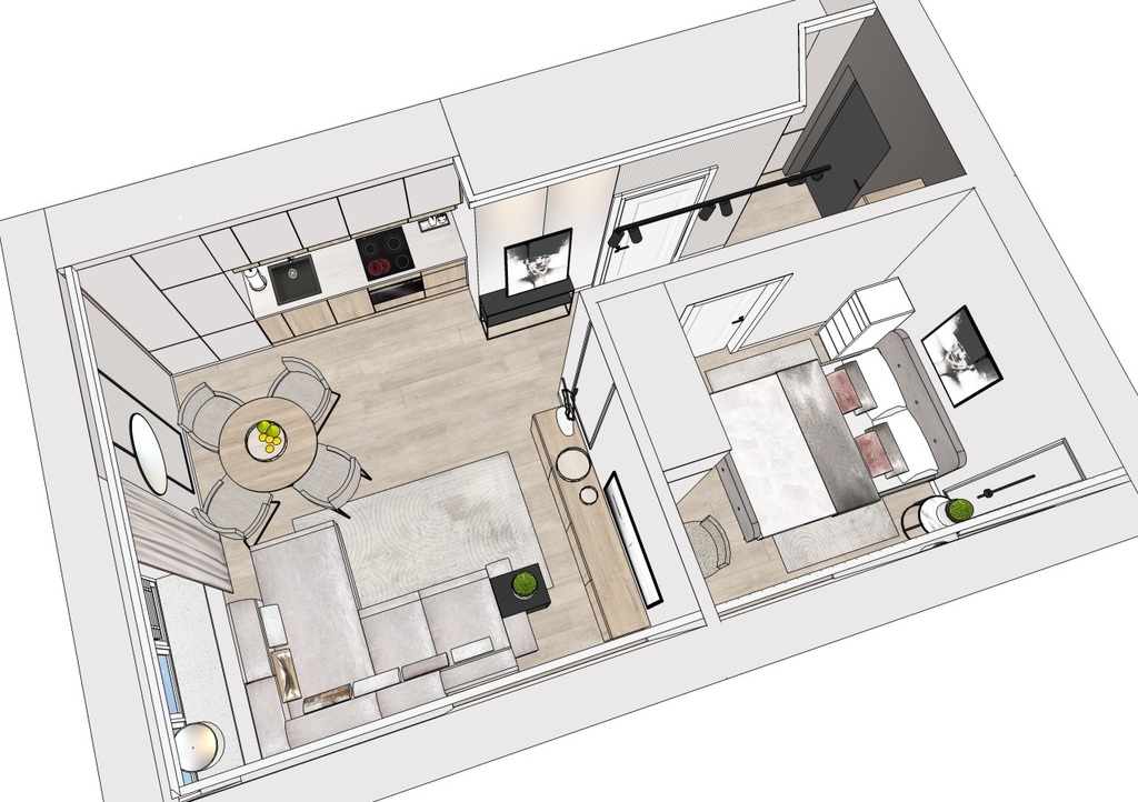 - Liczba pokoi: 2 (salon z aneksem kuchennym, oddzielna sypialnia)