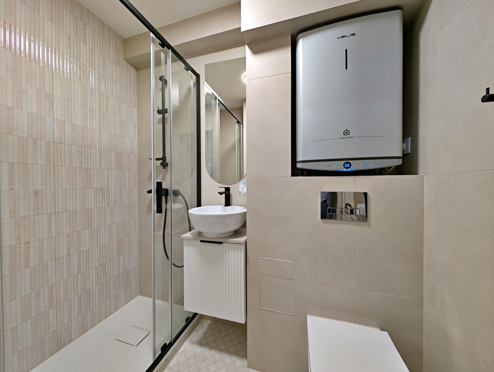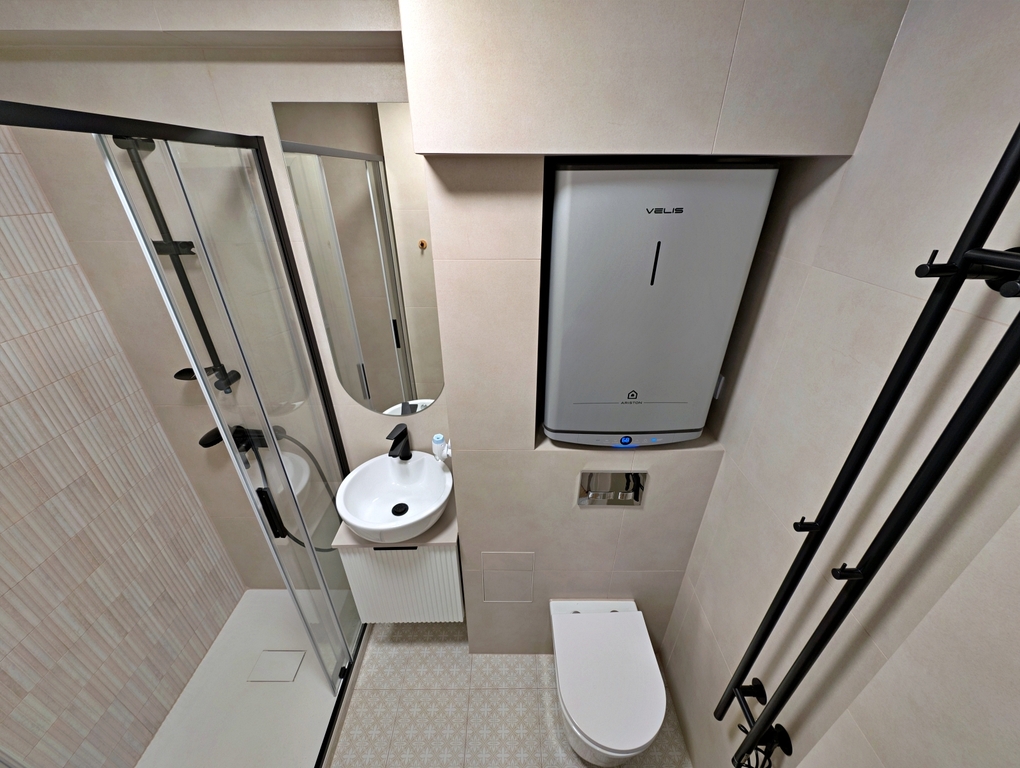 Ogrzewanie z sieci miejskiej, ciepła woda z bojlera.