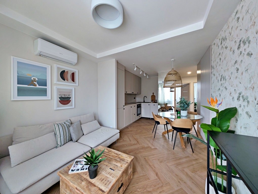 Powierzchnie: mieszkanie mierzy 42,99 m2 (w rzeczywistości po pomiarach 46 m2) powierzchni użytkowej i znajduje się na 3 piętrze niskiego bloku. Na powierzchnię składają się salon z aneksem, 2 pokoje, łazienka oraz przedpokój.