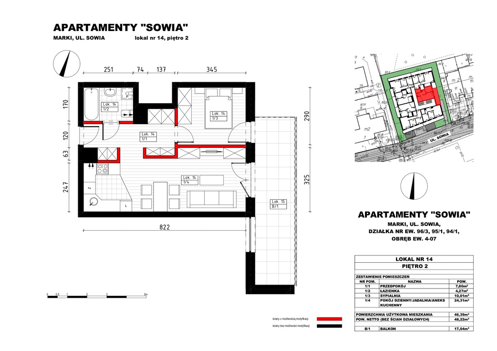 Mieszkanie o powierzchni 46,39 m2 składa się z:
