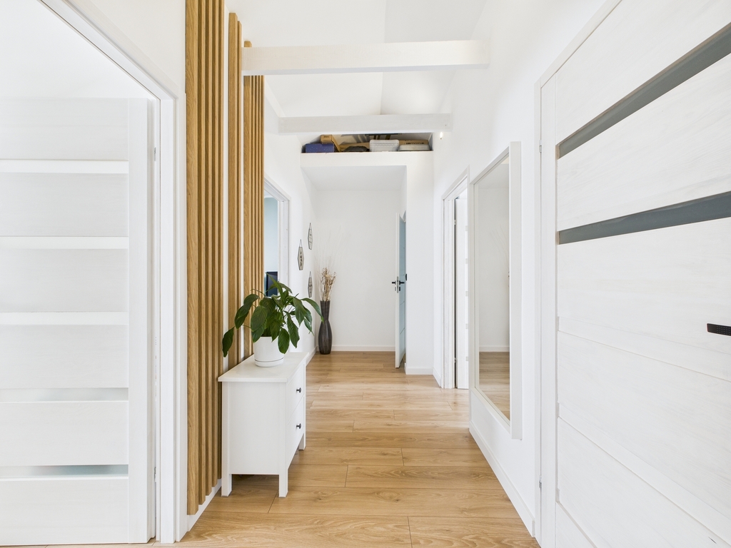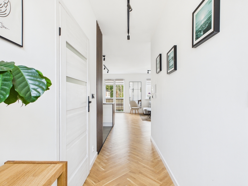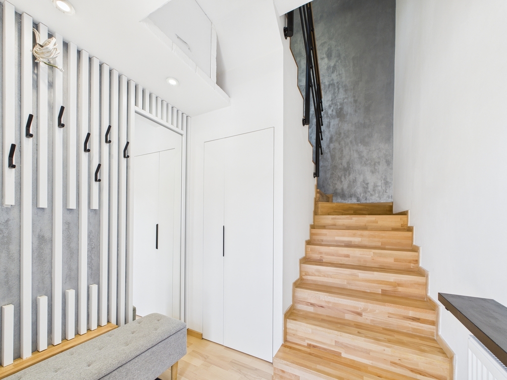 Parter: 6,95 m2 z Niezależnym wejściem z miejscem na kurtki oraz dodatkowym schowkiem pod schodami do przechowywania.