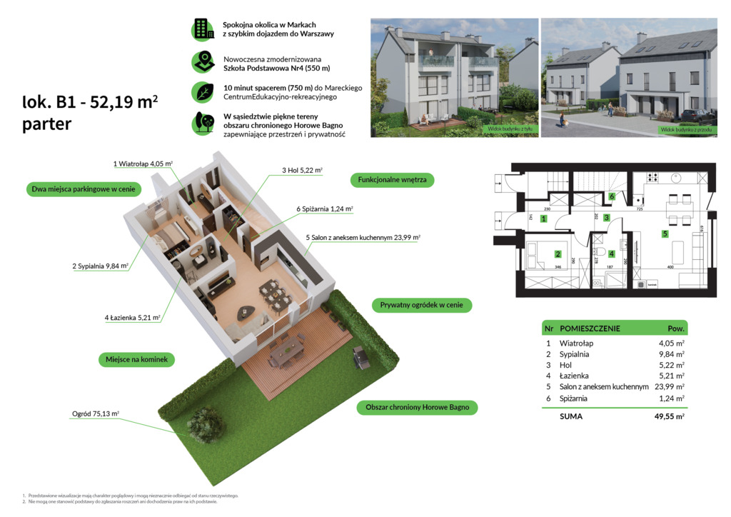 Przedstawione wizualizacje i grafiki mają charakter wyłącznie poglądowy i stanowią wyłącznie materiał pomocniczy, ułatwiający zorientowanie się w ogólnym wyglądzie oferowanej nieruchomości.
