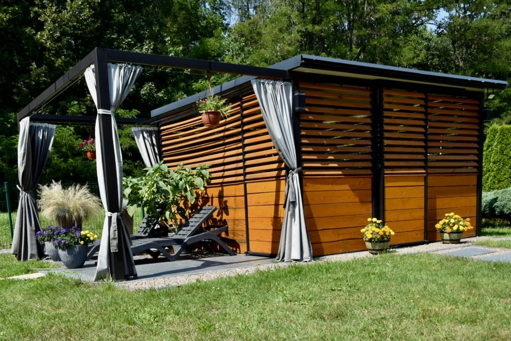 • ogród z murowaną altaną i kominkiem – wyjątkowa przestrzeń do relaksu i spotkań,