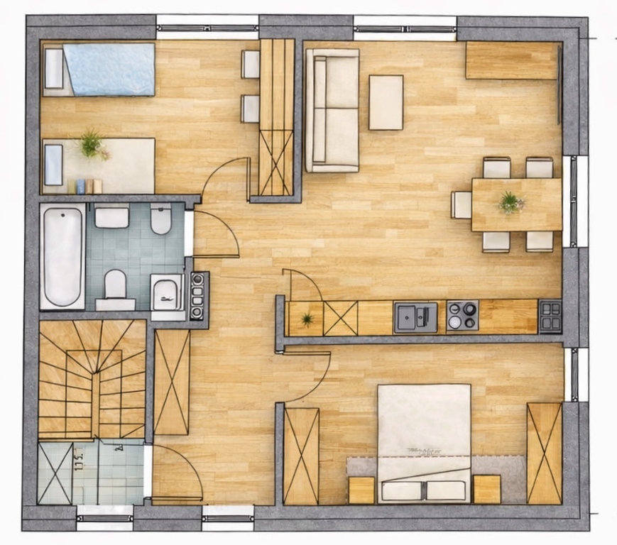 - bezpośrednie wyjście z klatki schodami na poddasze
