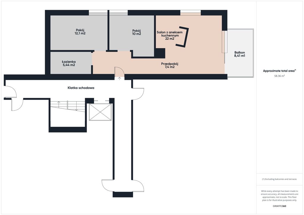 - Przestronny salon z aneksem kuchennym i wyjściem na duży balkon (22,11 m²)