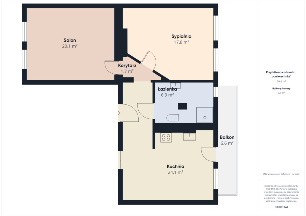 - kuchnia z jadalnią i wyjściem na balkon (24,1 m²),