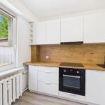 Kuchnia z meblami w stałej zabudowie została wyposażona w nowy sprzęt AGD, m.in lodówkę, zmywarkę, płytę, piekarnik.