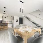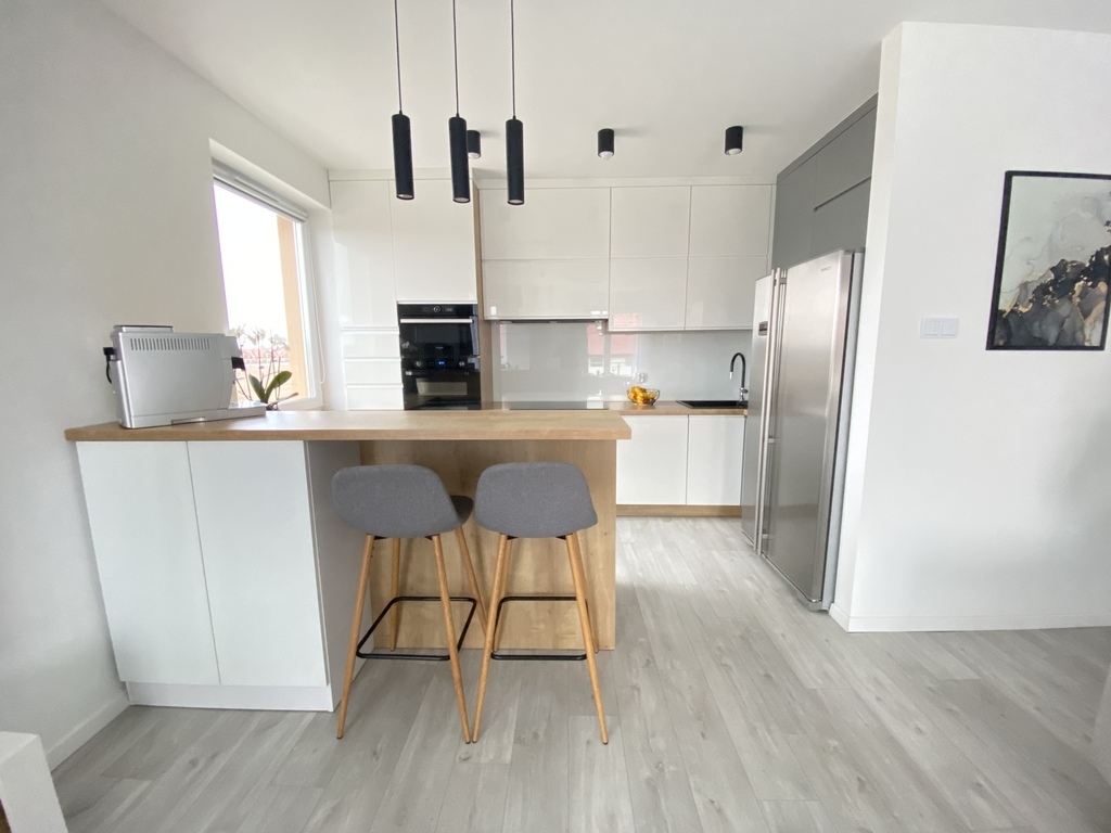 Kuchnia jest wyposażona w zabudowę kuchenną wraz z markowym sprzętem AGD, w tym m.in. piekarnik Dual Cook, płyta indukcyjna 5 -palnikowa, inteligentna mikrofala, lodówka, zmywarka.