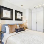 Sypialnia posiada wygodne łóżko oraz zabudowaną szafę i telewizor.