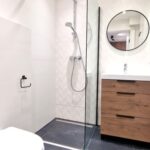 Łazienka – elegancka i nowoczesna, z brodzikiem oraz odpływem liniowym, zapewniającym wygodę użytkowania.