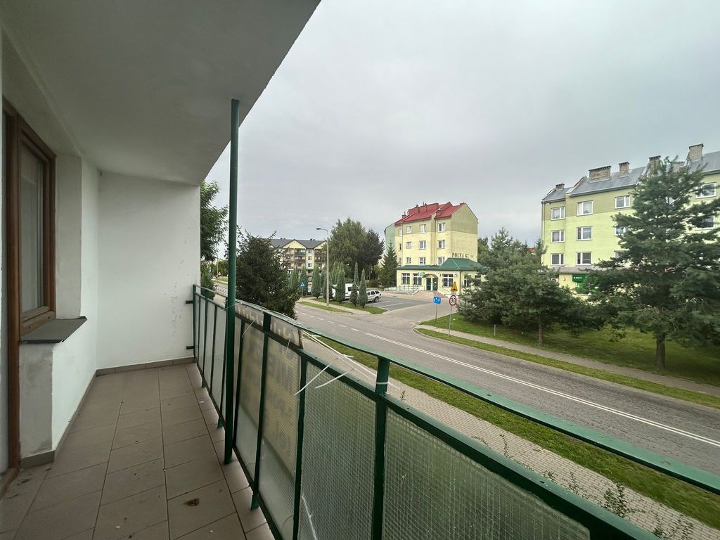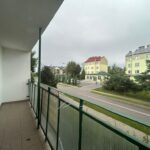 Salon z wyjściem na balkon, z którego mamy widok na drogę, która jest drogą osiedlową, a więc mało ruchliwą.