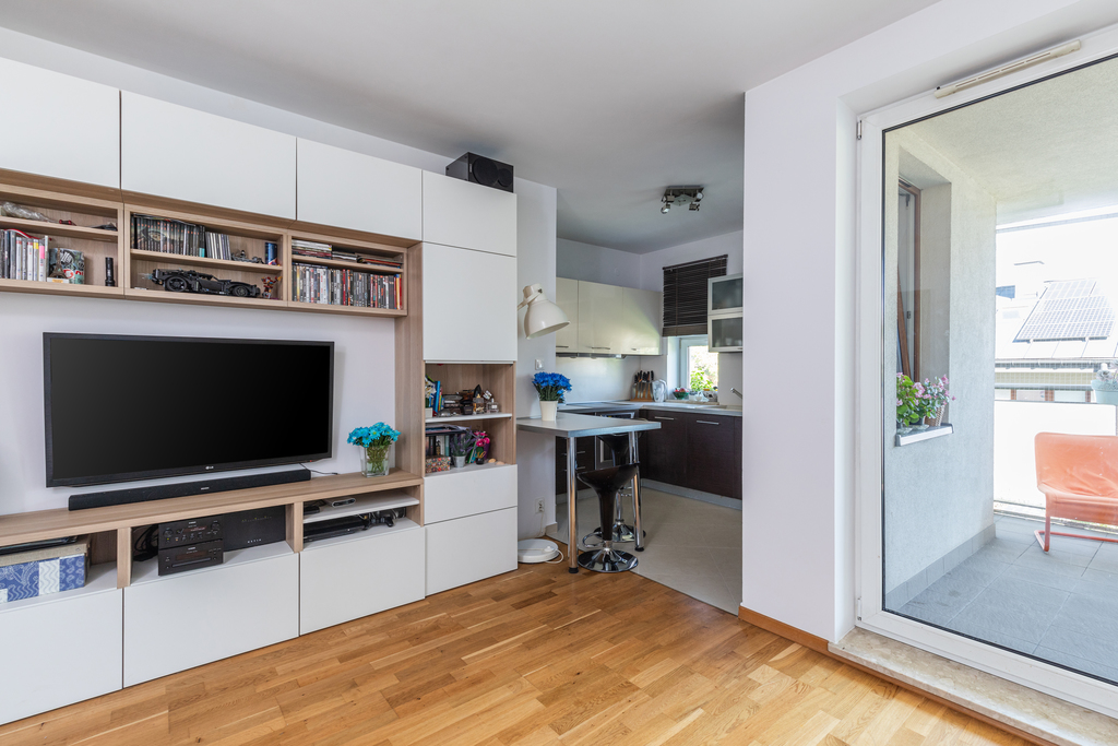 Na metrażu 48 m2 znajdziemy świetnie zaaranżowaną przestrzeń podzieloną na dwa pokoje - salon z otwartą kuchnią oraz sypialnię i łazienkę.
