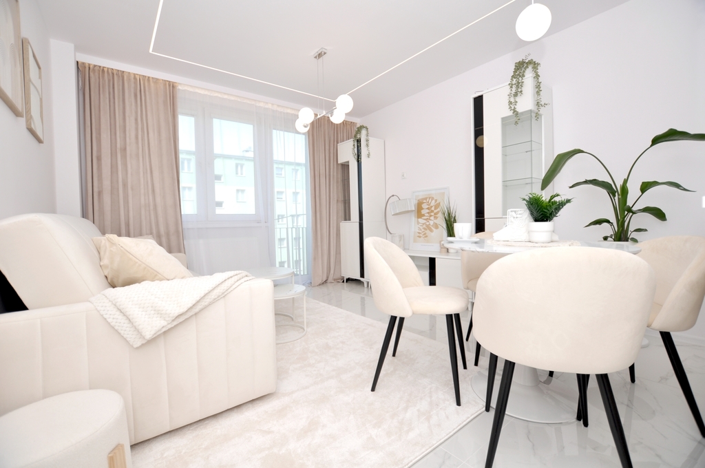 - Salon z balkonem – stylowy, jasny, z designerskim oświetleniem LED, rozkładaną sofą, stolikiem kawowym, stołem jadalnym i wyjściem na balkon